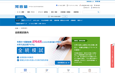 全統模試は、全国の受験生のデータによる「志望大学との距離を測る」ツールです。受験したままにならないようなさまざまな情報やコンテンツを提供しており、試験という学力評価の側面だけではなく、受験後の学習にも役立つ学習教材という側面も併せ持っています。高校生・高卒生を対象に年間30回以上の模擬試験を全国で実施。最新の入試傾向の徹底分析と全国の受験生のべ約300万人(2019年実績)の豊富なデータから受験動向を把握し、的確な評価とアドバイスを提供します。