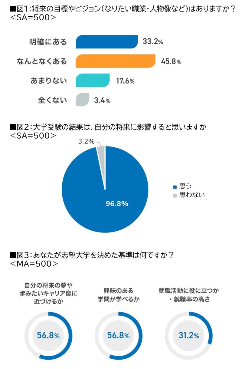 [トピック1] 高校生の約8割は、将来の目標やビジョンを持っている! さらに、96.8%が大学受験の結果が自分の将来に影響すると感じている。 実学や就職を意識するなど、志望大学の選び方に反映する結果に。