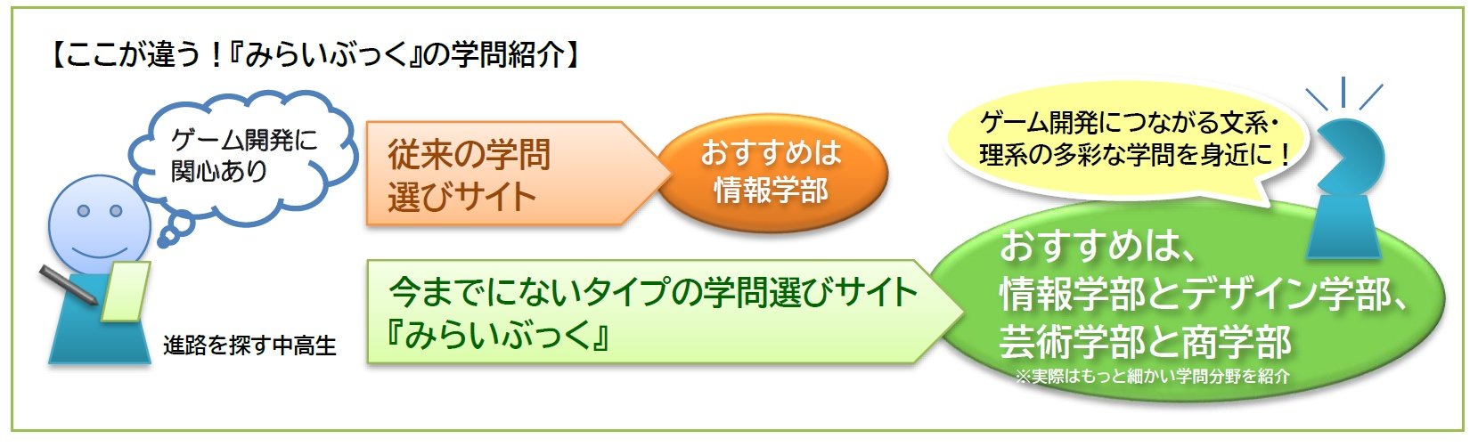 これに対し『みらいぶっく』は、文系理系を問わず多彩な社会とのつながりから、関連する学問すべてを紹介する、今までにないサイトです。ゲーム開発であれば情報学に加え、デザイン学(ex.画像処理)や芸術学(ex.ゲーム音楽、シナリオ作りの文芸)、商学(ex.売れるゲームのマーケティング)等々、さまざまな学問を紹介。
