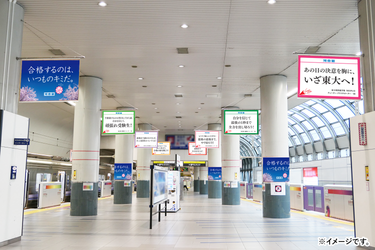 河合塾は、国公立大入試を控えた全国の受験生を応援する交通広告を、2月23日(月・祝)*から主要都市の駅や電車内に掲出します。夢に向け、これまで頑張ってきた受験生が試験当日に力を発揮できるようにと、全国の校舎スタッフと講師が願いを込めたメッセージを掲出。試験会場に向かう道のりで目に留めていただき、受験生の挑戦を後押しします。