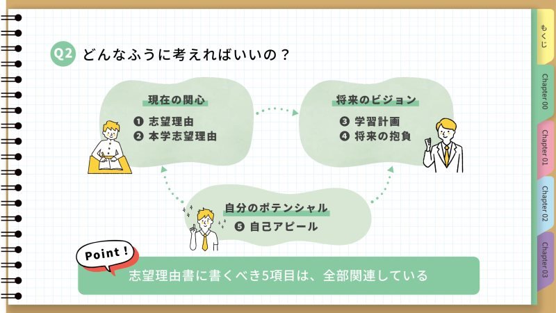 - 将来のビジョン(大学での学習計画やその先の将来)