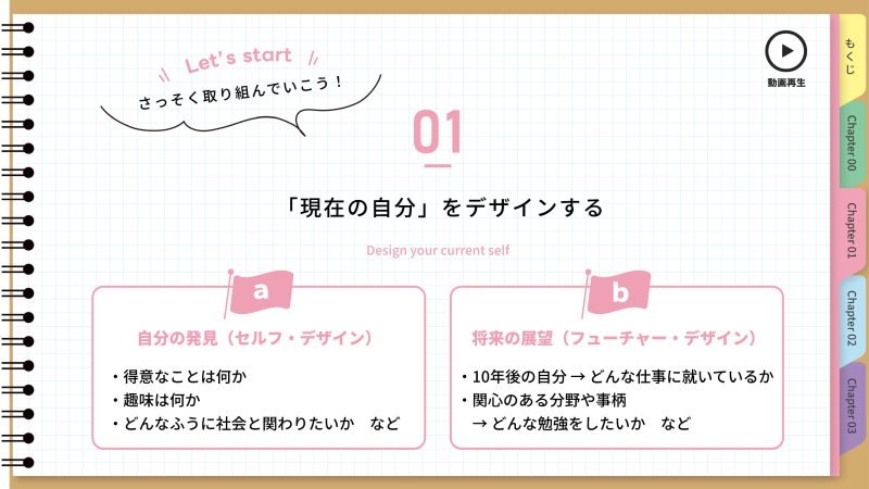 デジタルブック式ワークブック(全編レクチャー動画付き) 対象:高等学校向け教材。高3時に総合型・学校推薦型入試への出願を視野に入れている高1・2生の指導用を想定しています。授業内、もしくは自宅学習での活用が可能です。