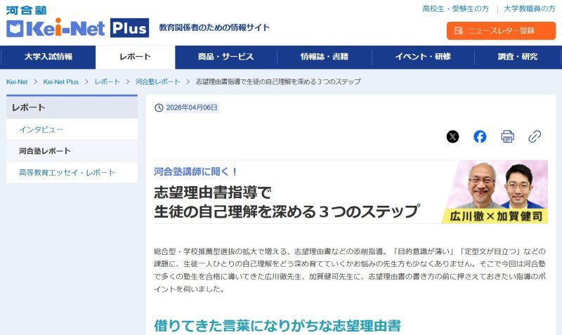 リニューアルを記念して、河合塾小論文科で本書の作成にも携わった 広川徹講師、加賀健司講師の特別対談「河合塾講師に聞く! 志望理由書指導で生徒の自己理解を深める3つのステップ」を 掲載中です。
